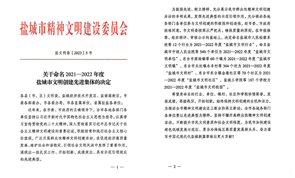 近日,市精神文明建設(shè)委員會(huì)印發(fā)《關(guān)于命名2021—2022年度鹽城市文明創(chuàng)建先進(jìn)集體的決定》,鹽城市海興集團(tuán)被授予“鹽城市文明單位”榮譽(yù)稱號。2023-10-13 -